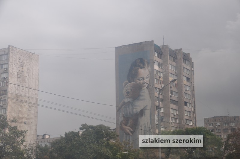 Przy wjeździe do miasta powitał nas smutny mural na bloku przedstawiający dziecko trzymające misia. Miś na miarę naszych możliwości… Brak słońca, wiszące nad naszymi glowami ołowiane chmury, dziurawe drogi, rozwalone mosty potęgowały depresyjny nastrój. Miś? Dzieci? To nie żąrt, miasto ucierpiało od rosyjskich bomb i ostrzałów w 2014. I kto by pomyślał, że parę miesięcy po naszej wizycie wszystko zacznie się od nowa.